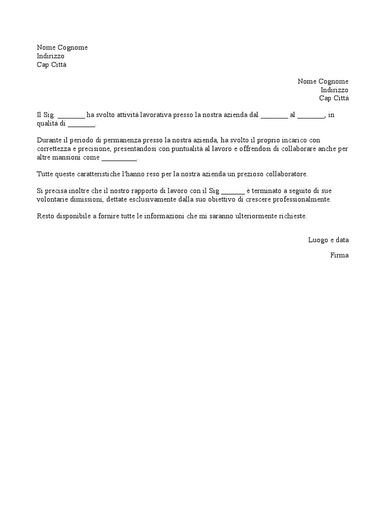 Lettera di referenze fac simile WORD